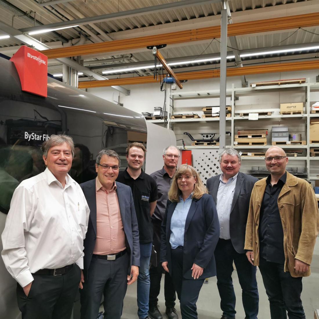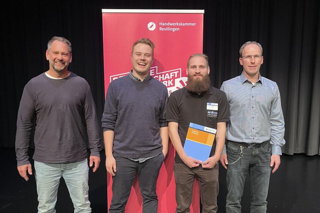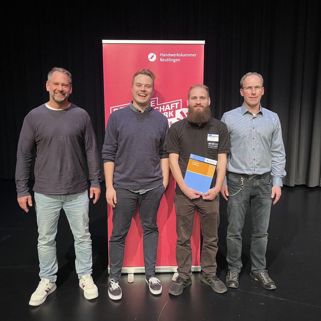 An der Feierstunde in der Stadthalle Metzingen am 12.12.2023 nahmen (von links) Ausbilder Steffen Stoll, Geschäftsführer Adrian Burghard, Preisträger Lukas Wietstock und Ausbilder Rainer Stiefel teil.