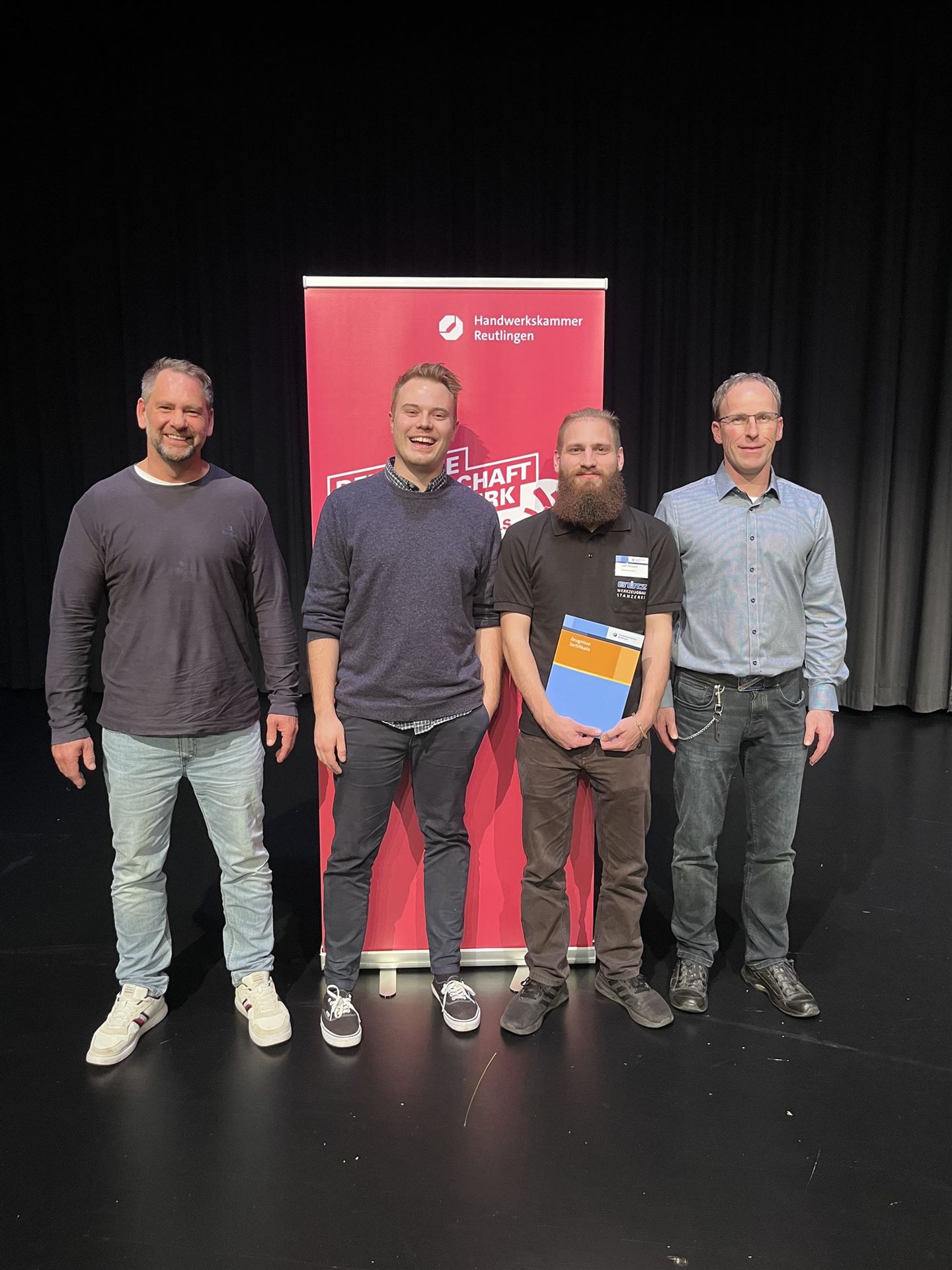 An der Feierstunde in der Stadthalle Metzingen am 12.12.2023 nahmen (von links) Ausbilder Steffen Stoll, Geschäftsführer Adrian Burghard, Preisträger Lukas Wietstock und Ausbilder Rainer Stiefel teil.